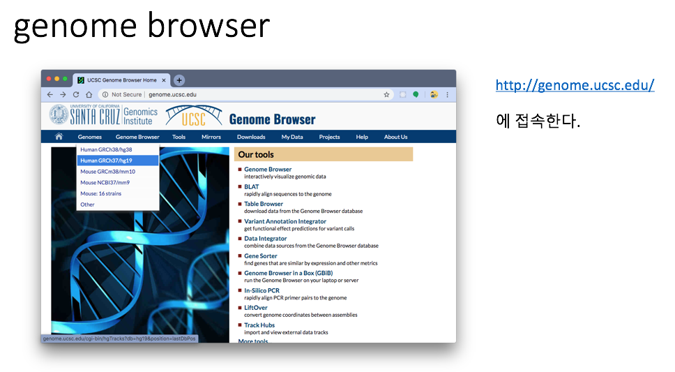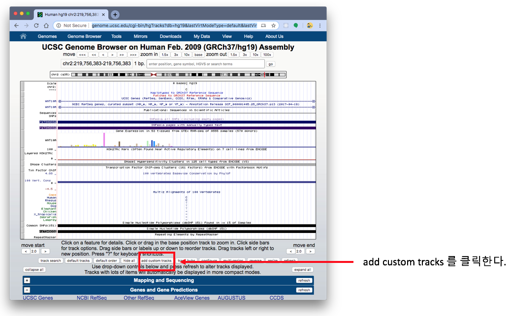 1) http://genome.ucsc.edu 에 접속하여 Genomes의 Human GRCh37/hg19 을 클릭한다.
