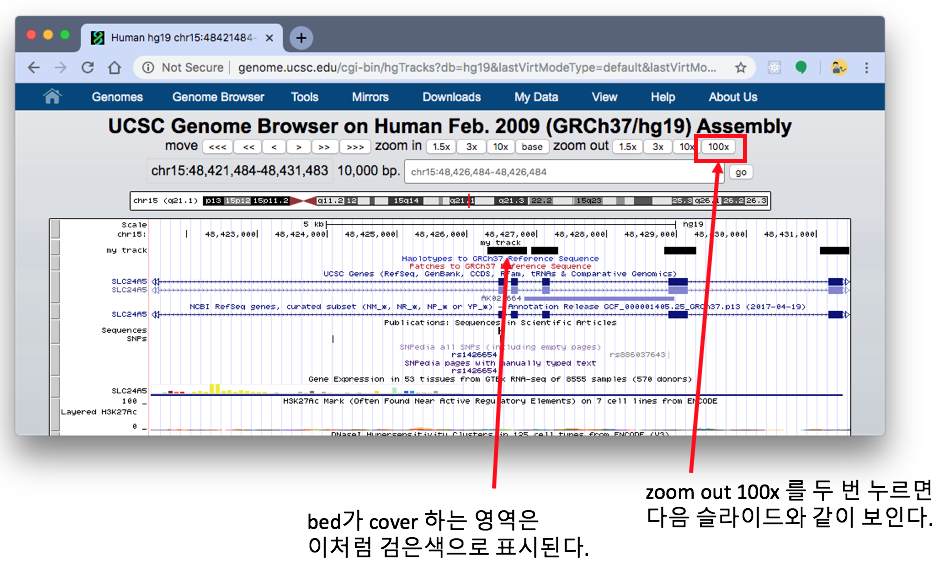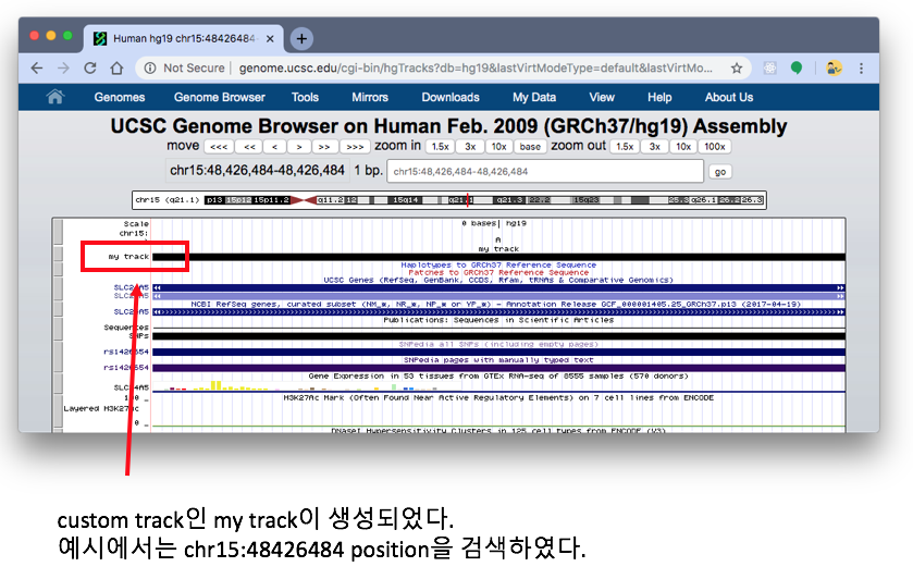 9) custom track이 genome browser에 추가되었다. 다음 그림은 chr15:48426484 를 검색한 것이다.