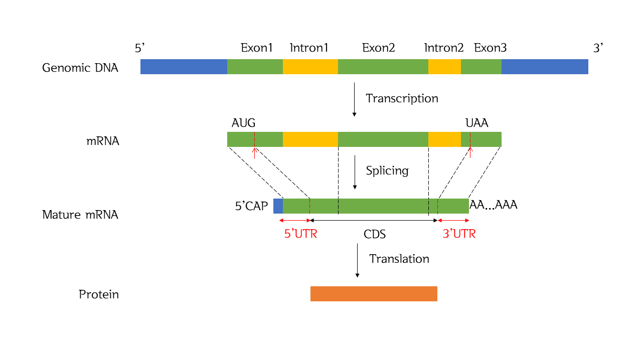 Genomic DNA에서 전사(transcription)가 일어나서 mRNA가 됩니다. 이때 Exon안에서 시작 코돈(AUG)과 종결 코돈(UAA)이 있습니다.