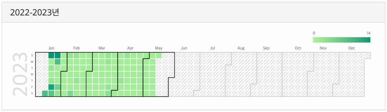 github과 같은 사이트들은 아래 그림 처럼 자신의 code를 commit 할 때 마다 잔디와 같이 초록색 네모를 띄워줍니다. 이를 매일 채우게 된다면 그만큼 뿌듯하겠죠? (열심히 채워야겠습니다.. ㅜㅜ 초록색이 텅텅이 입니다.. ㅋㅋ) 이처럼 진행상황을 시각적으로 보여줄 수 있고 이를 내가 다시 보면서 습관을 강화할 수 있도록 만드는 전략을 세워보세요!
