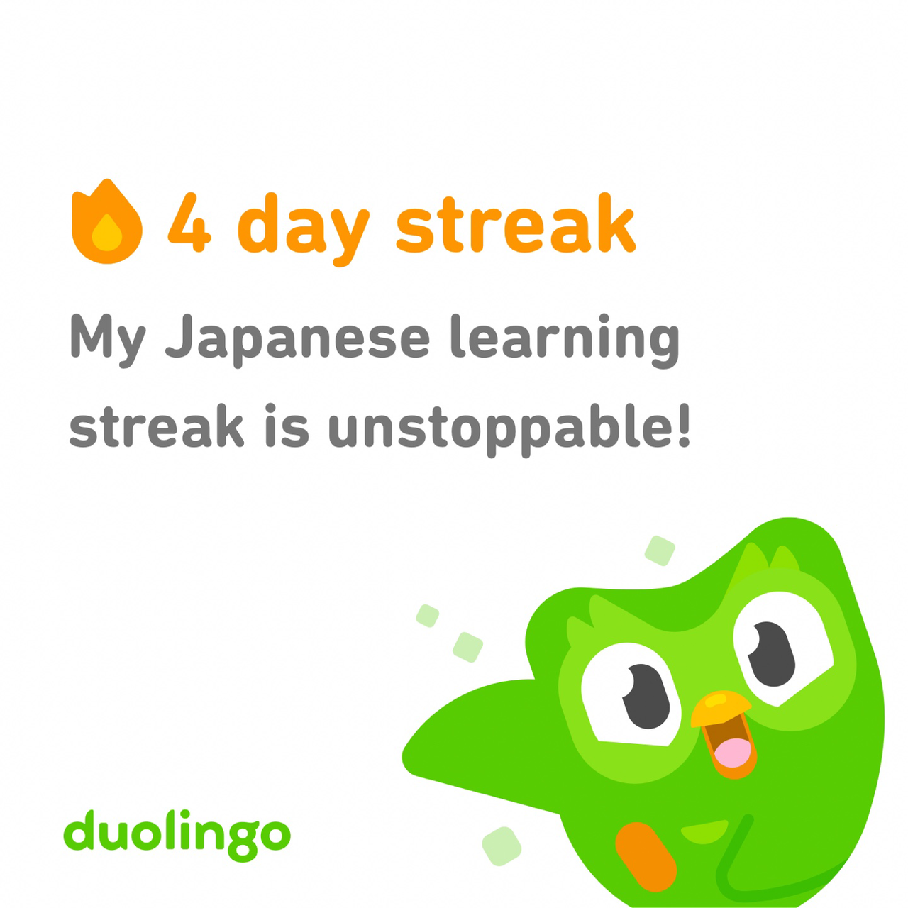습관에 따라 수행하고 있는 도중, 작은 업적이라도 세웠다고 하면 스스로를 칭찬해보세요. 예를 들어 매번 목표가 작심삼일로 돌아가는 누군가가 4일 째 어학 공부를 매일 이어서 하였다면 그 자체로 스스로를 축하해주고 파티를 열어주는 것입니다. 예시로 아래 일본어 학습 4일째가 된 듀오링고 스크린샷. 듀오링고 홍보는 아닌데, 어학을 배우기에 좋은 것 같습니다. 다만 돈을 안내면 광고가 너무 너무 너무 많이 나옴.. 어학이란게 자꾸 안쓰면 점점 까먹어져서.. 억지로라도 유지를 해야해서요.