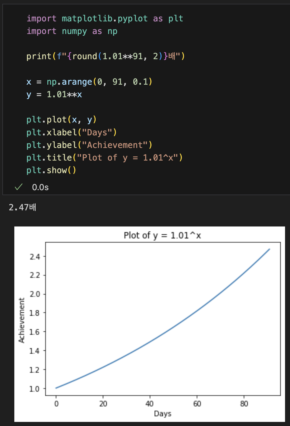 매일 1%씩 더 하면 2.47배 만큼 더 해낼 수 있습니다! (1.01)^(91) = 2.47